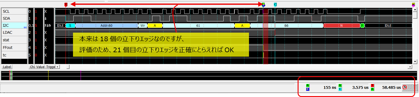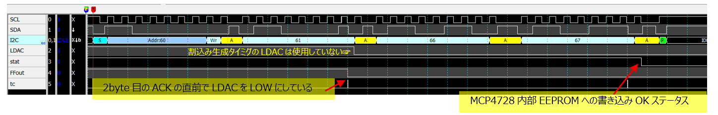 上記仕様書にもあるようにI2Cデータ書き込み時、2byte目のACKの直前CLKの”low”の期間でLDACをLOWにする必要がある。これが一番の課題!