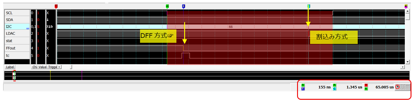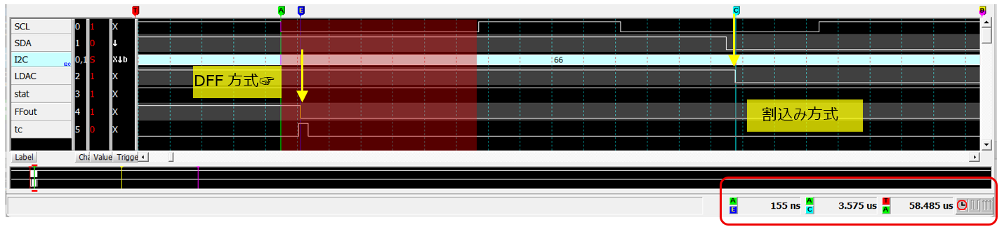 逆にPSoC3では割り込み形式ではI2C CLKタイミグで1CLOCK安定してずれてしまう。