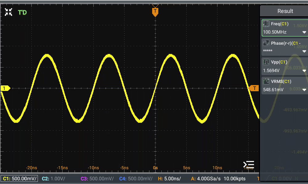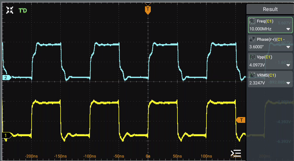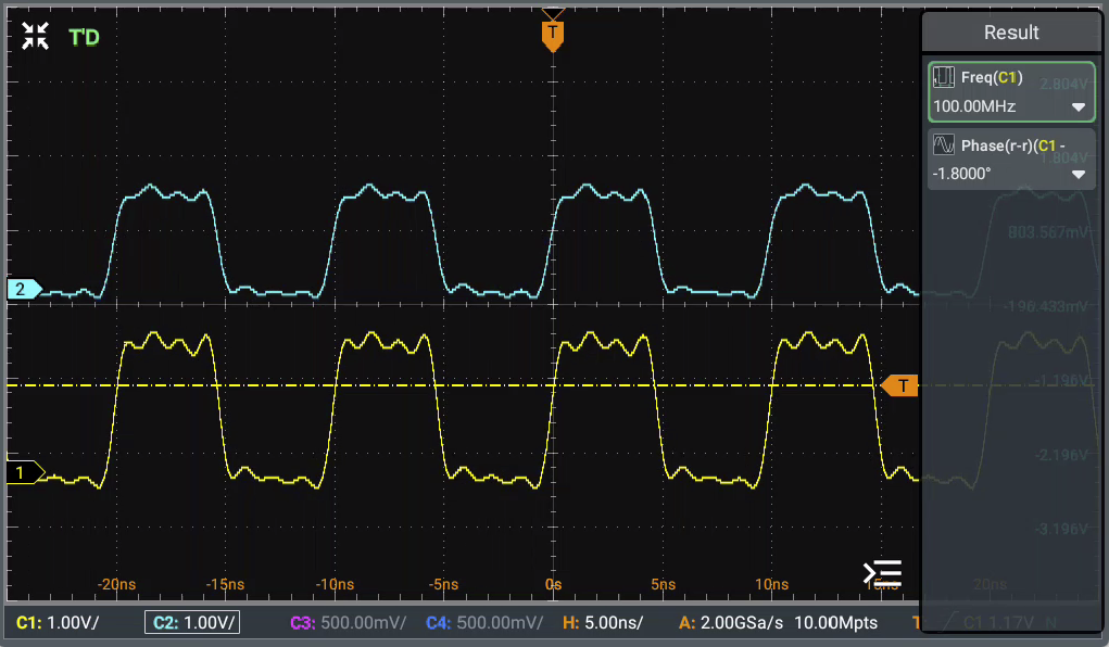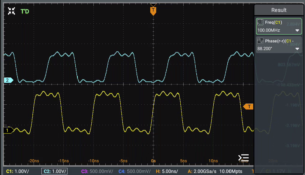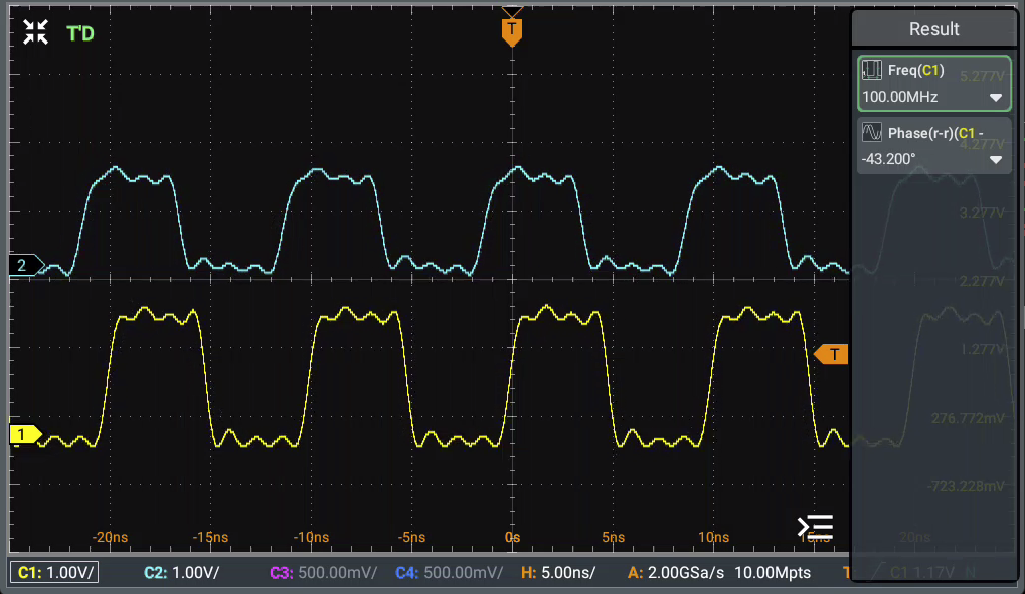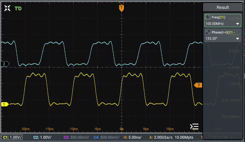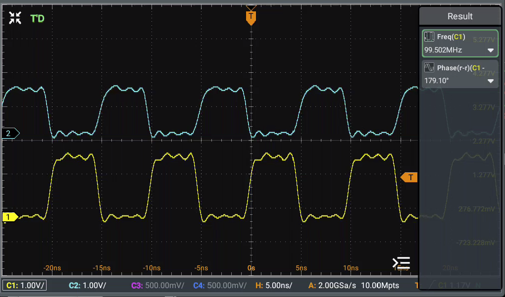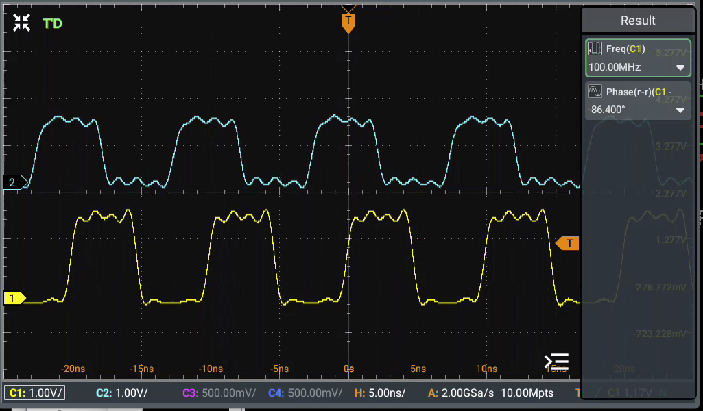 ※オシロの入力は50Ω受けに設定。our0,out1間の位相を測定