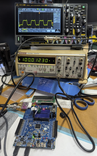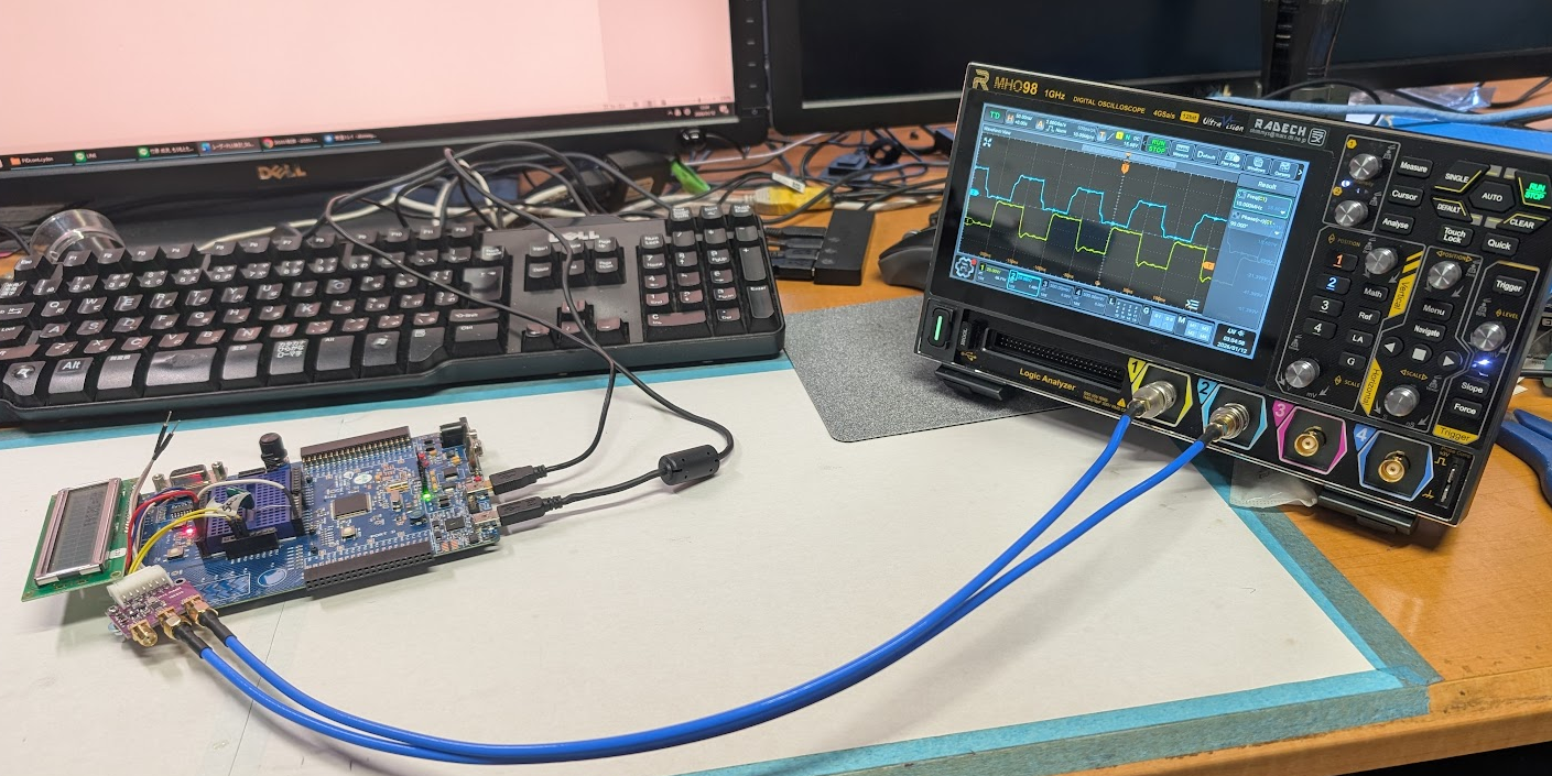 si5351aデバイスで100MHzを出力する場合、内部分周比とdelayレジスタの関係で位相制御分解能が最小45度になってしまう。出力周波数を仮に10MHzにすると、位相制御分解能は数度で制御することが可能である。