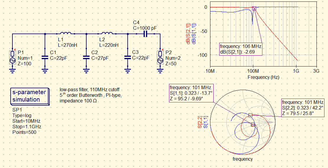 ここでの注意はsi5351aの出力インピーダンスは約100Ωで、本装置先に接続するデバイスの入力インピーダンスはおそらく50Ωになっているという前提で以下のような5次、LCバタワースフィルタを設計・シミュレーションおこなった。